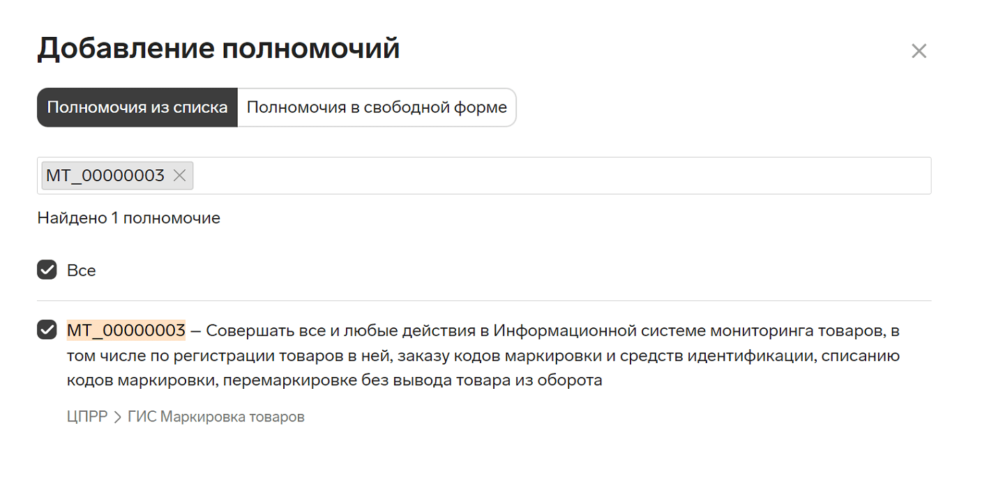 МЧД единого формата выпускают в сторонних сервисах, например, в Контур.Доверенности. Принимают их не только в системе маркировки, но и на других платформах, в том числе, Федресурсе и Центробанке. Названия полномочий для Честного знака начинаются на MT_. Еще для работы с универсальными передаточными документами (УПД) в системе маркировки нужны МЧД с кодом полномочия BTBO_00000003.